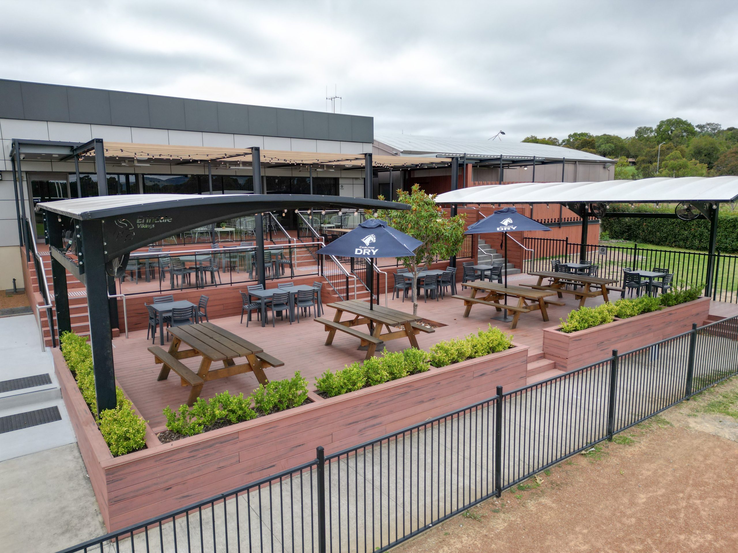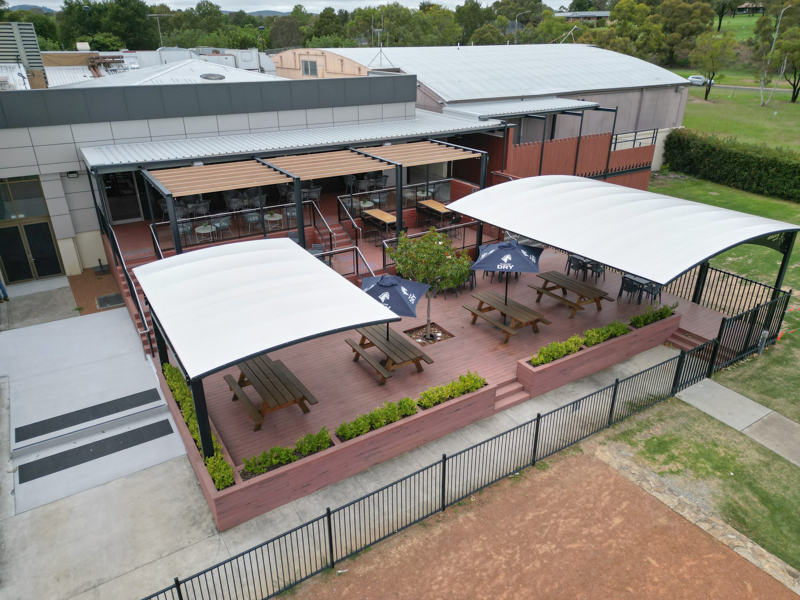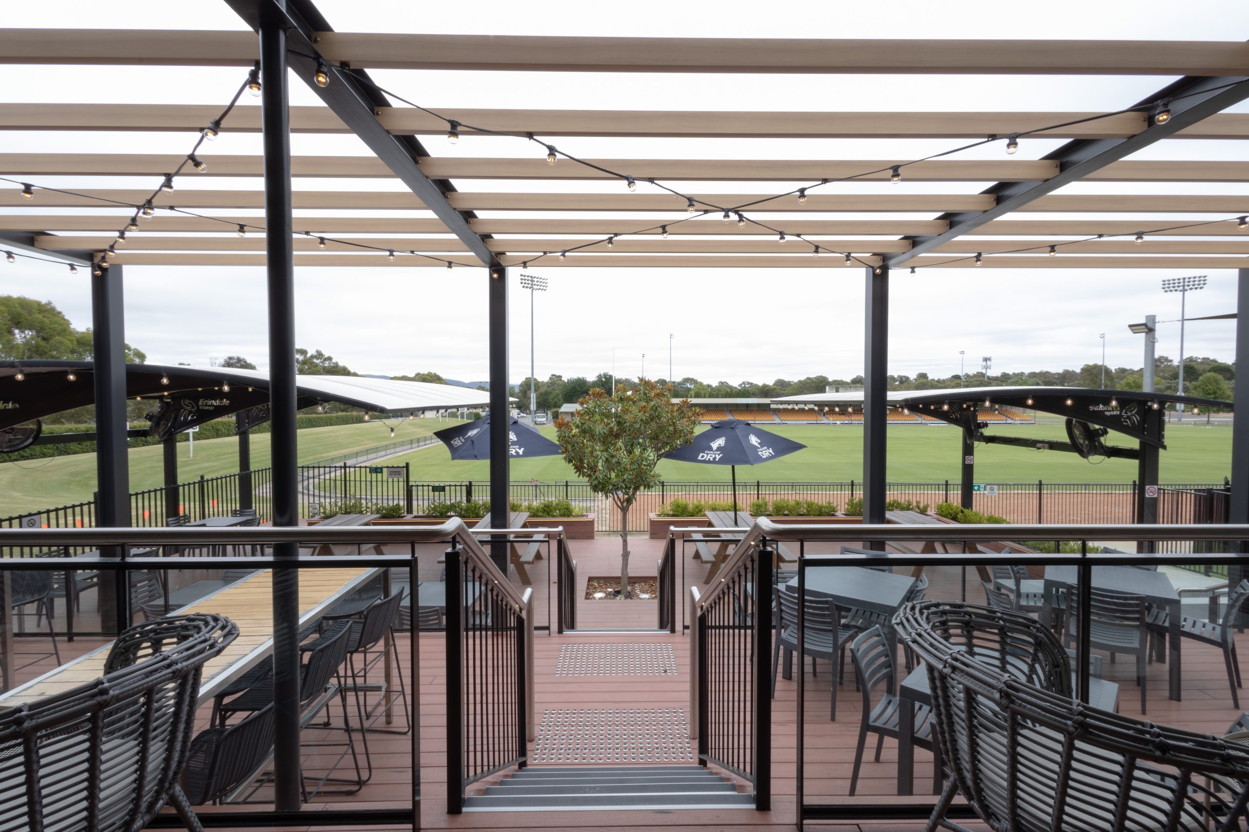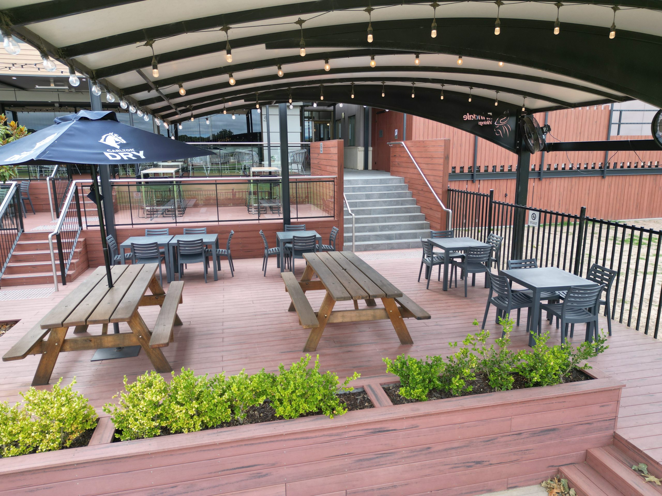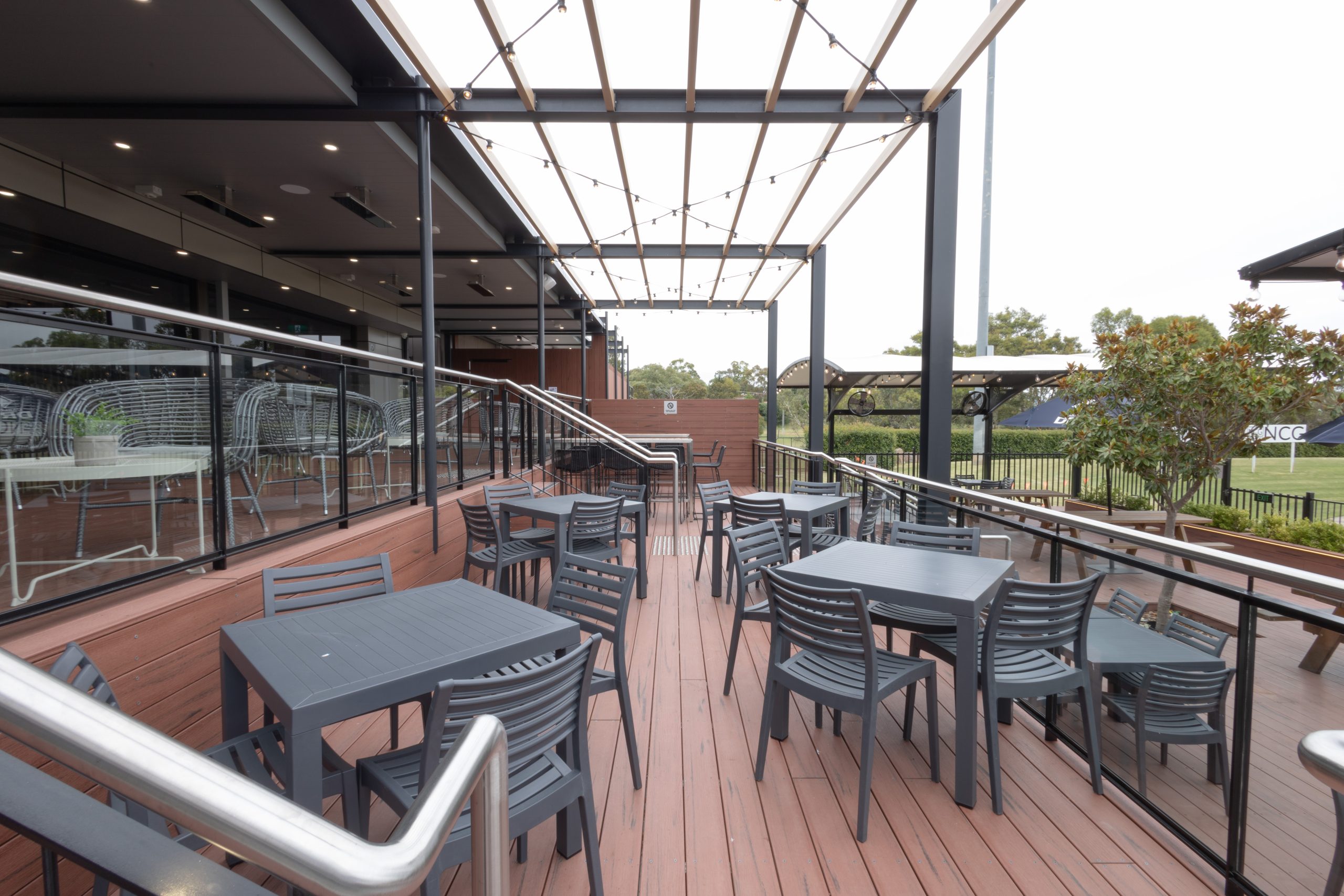 A new internal switchboard was installed to support the venue’s expanded outdoor facilities, supplying power to heaters, weatherproof outlets, and custom feature lighting, alongside the integration of DALI-controlled LED lighting throughout both extensions.
